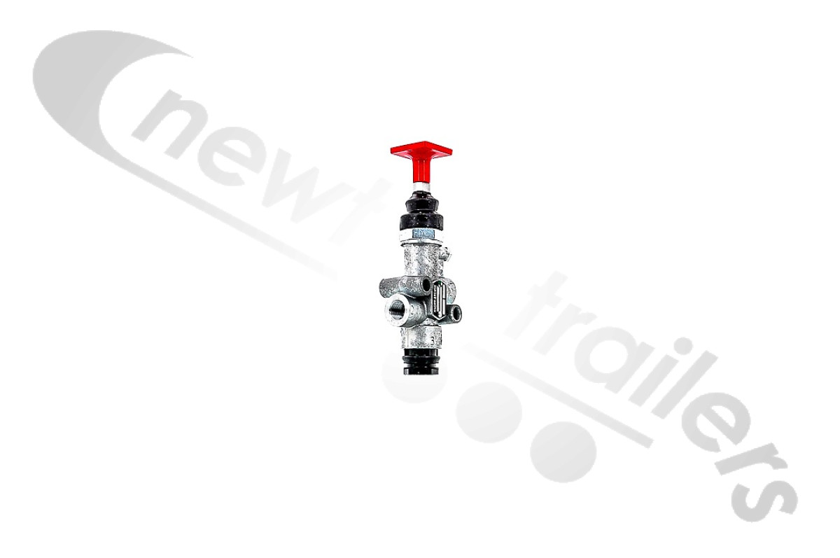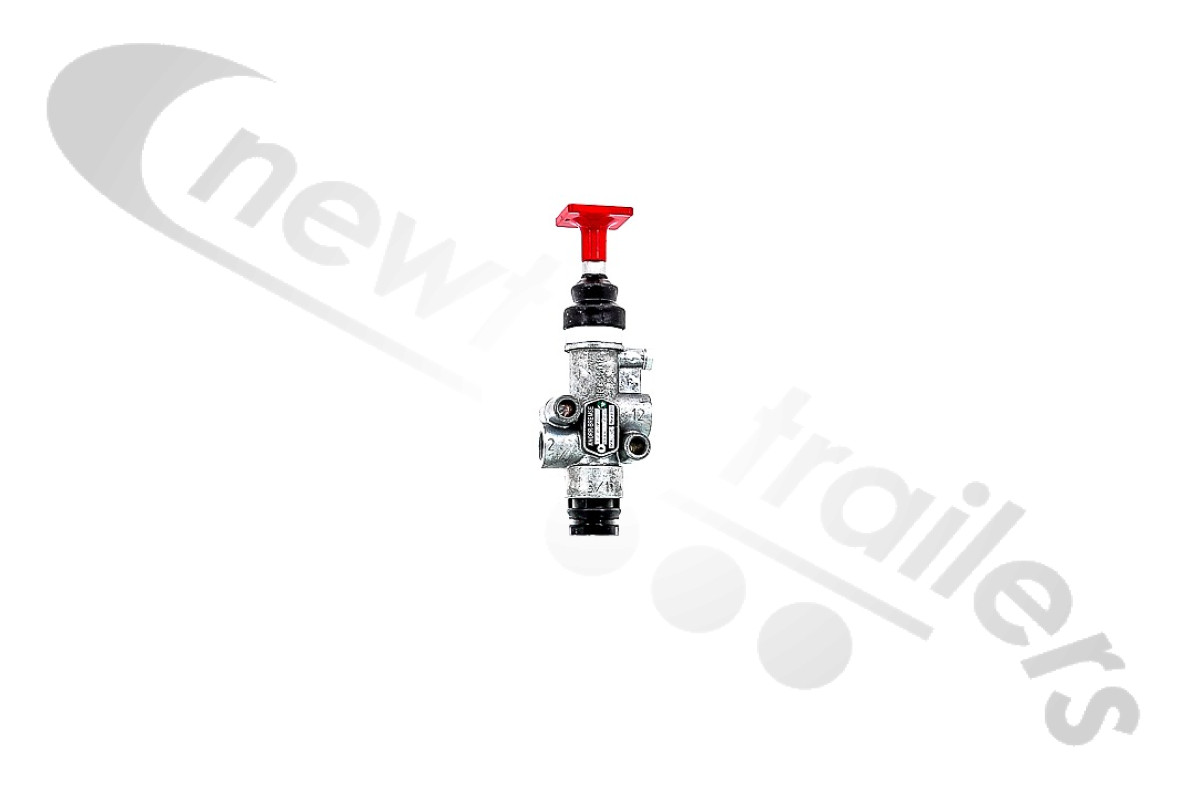 The Trailer Park Valve operates the parking brake function of trailers equipped with spring brake actuators. Whether coupled or uncoupled, the red control button must always be pulled out to correctly park the trailer. By pushing in the control button, the spring portions of the spring brake actuators are supplied with air so that the parking brake is released.
